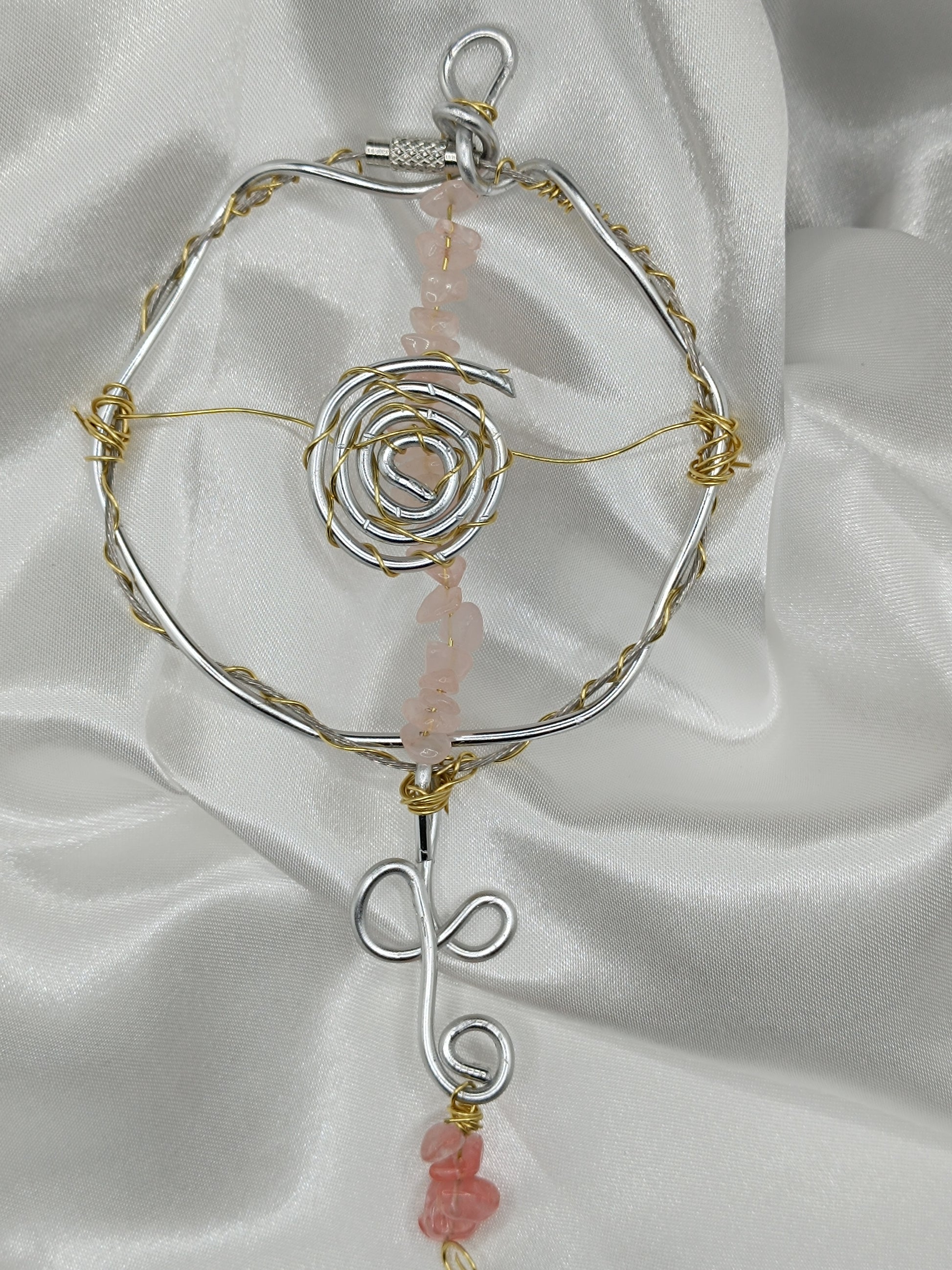 Décoration murale 100 % réalisé à la main comme chacune des décorations murales elle est composée de fil de nylon de fil de fer de pierre de quartz rose et de pierre de quartz cerise accroché dans votre maison elle vous aidera dans la vie de tous les jours